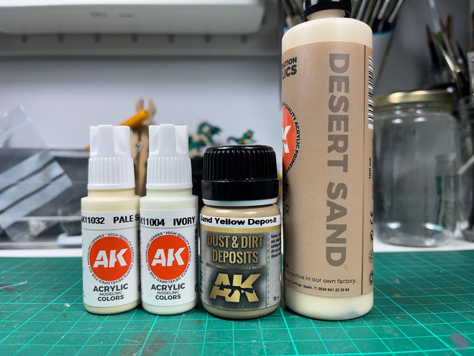 I used Desert Sand primer (no airbrush) to cover some blue stains and errors on the sand (after the whole model was painted). Then drybrushed AK Pale Sand and Ivory. After that I used enamel based Sand Yellow Deposit and cleaned it using white odorless spirit.