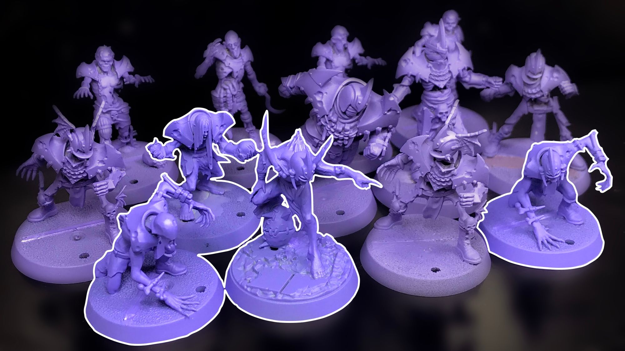 At the time it seemed a good idea because this team has a lot of ghouls (pale skin, mixing purple with Rakarth flesh... I like that) and purple armour. And once the whole bunch was primed they looked so good we even joked about leaving them like that (like a monocolour team you just assembled out of the box, but hiding all the conversions).