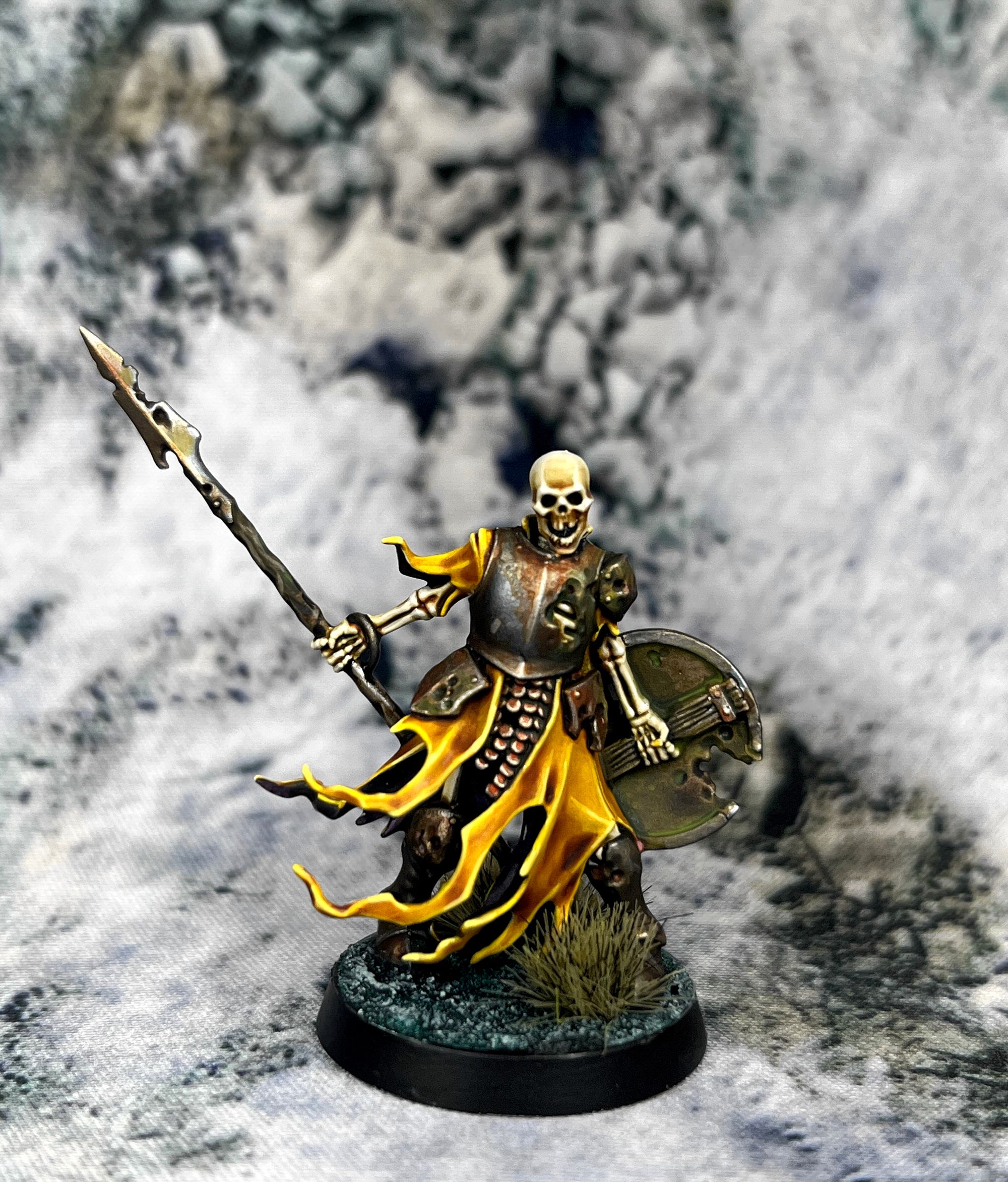 I decided to build a new skeleton. I primed him in Wraithbone and went for a rusty purple tone and yellow clothing and details.