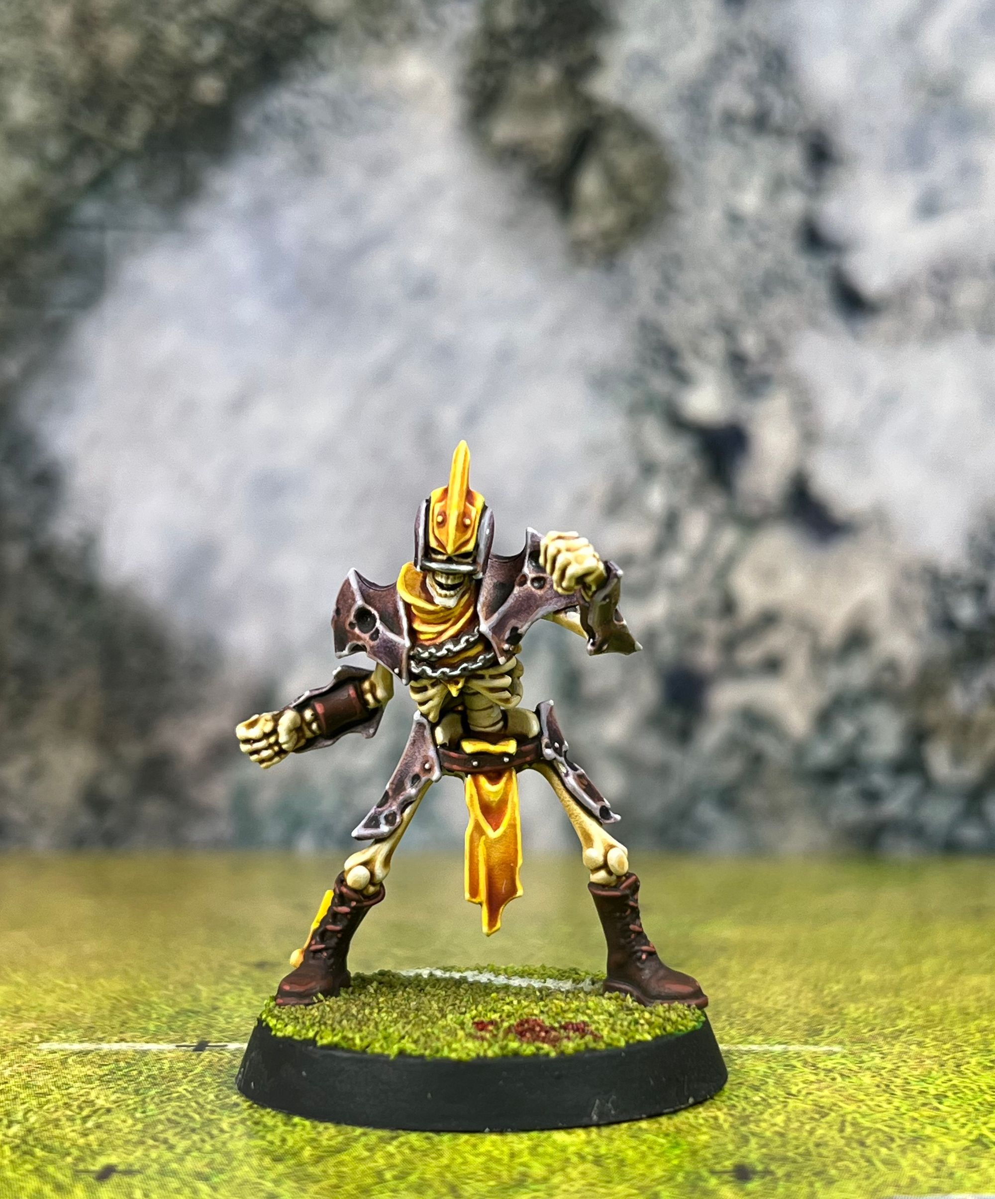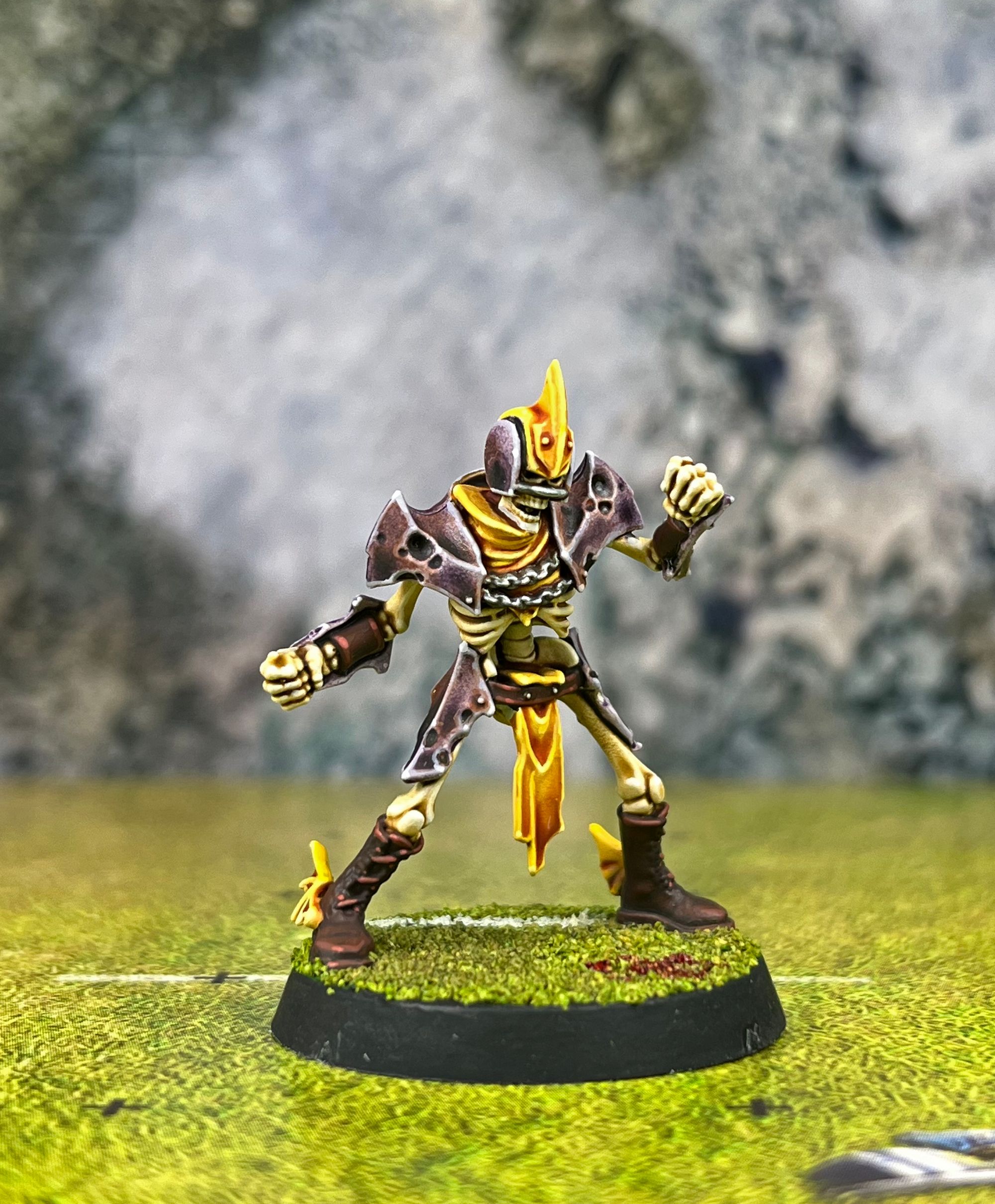As I said, the problem was the team was all primed lilac. So, I decided to build a new skeleton (I already ruined one testing colour schemes). I primed him in Wraithbone and went for a rusty purple tone, and yellow clothing and details.