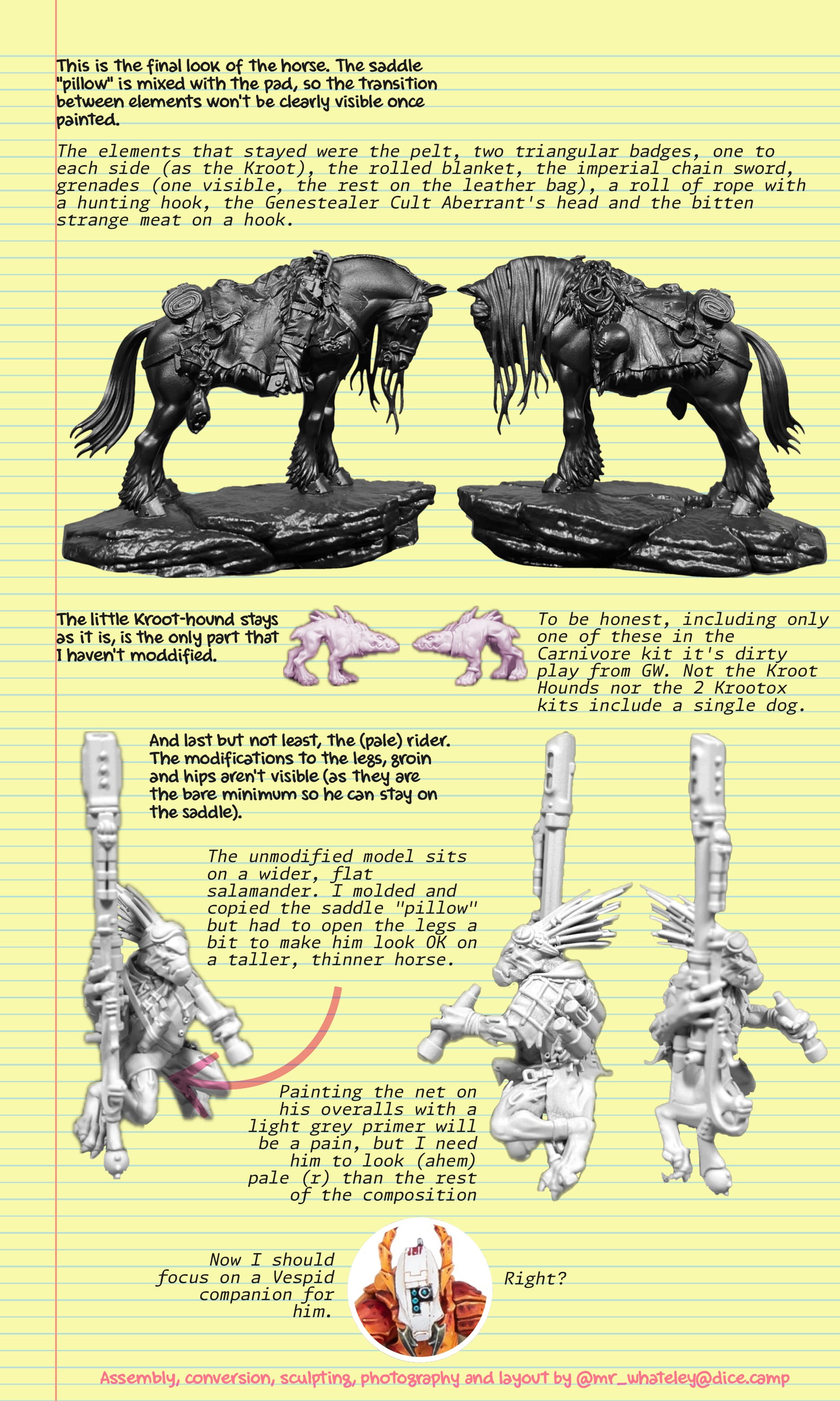 On the painting side of things, I'd like to use some Native American style war paints on the horse, with futuristic, Kroot-related, Tyranid hunter meaning, but doing that in a respectful way (and with admiration, let's say) it's no easy task as I've got a narrow knowledge on the matter (and the internet is so full of shit lately that looking for resources in non-academic format is being a pain in the ass), so be gentle with this poor old guy.