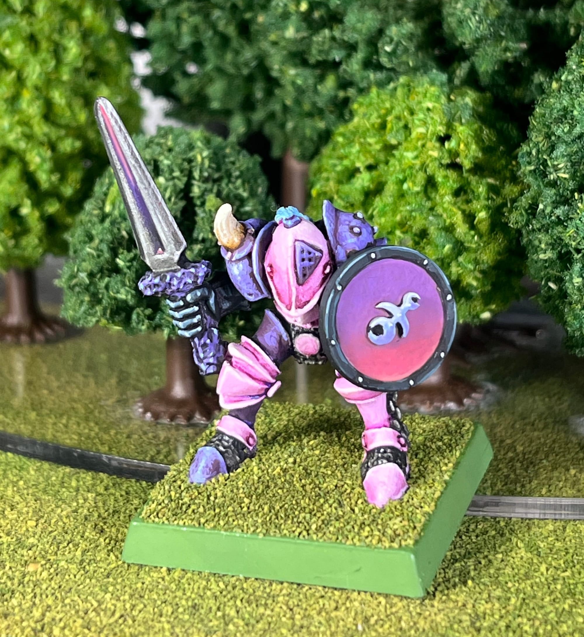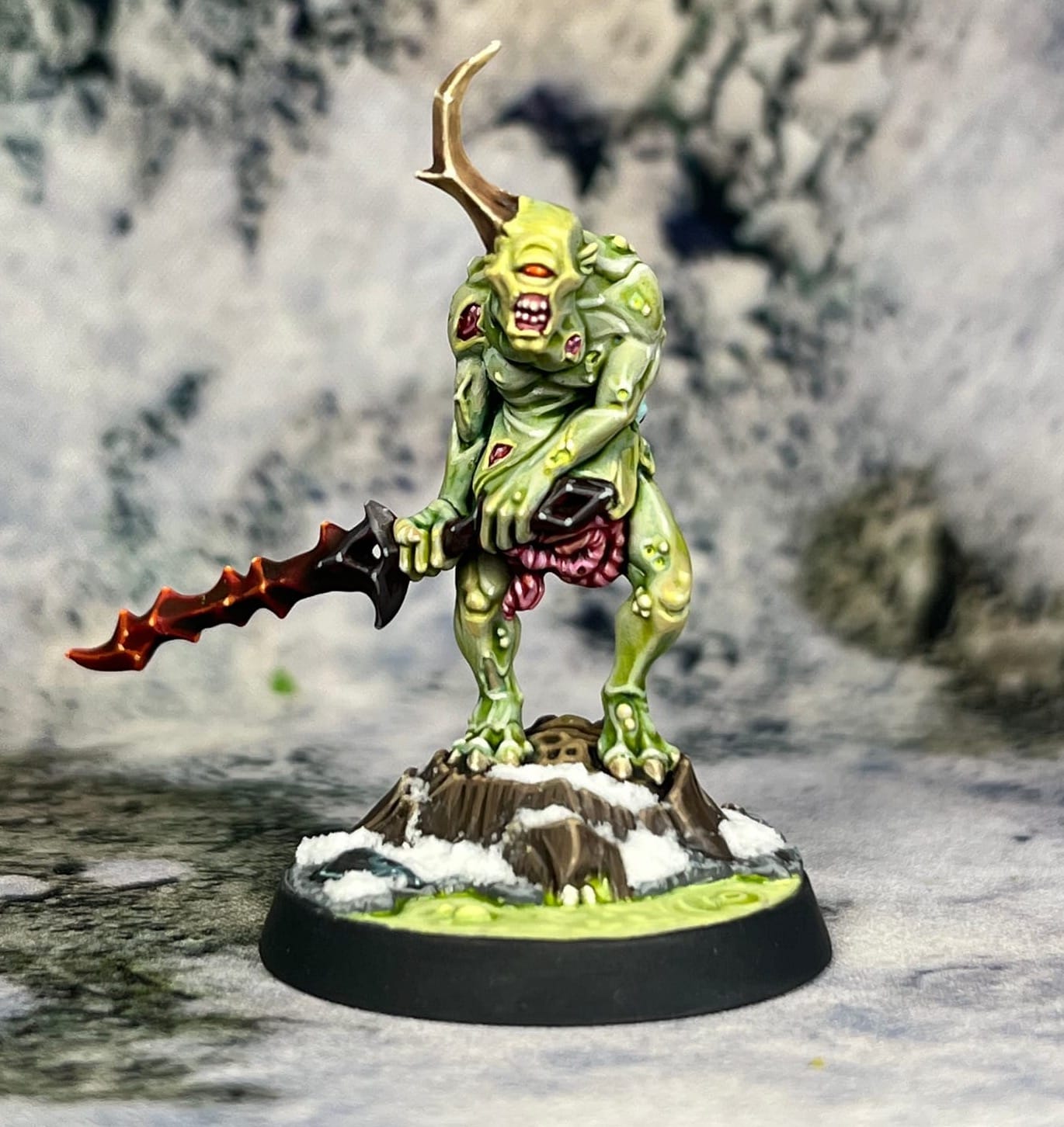 I needed some of those painted for a Spearhead army, and Nicky Grillet's Grandfather's Gardeners are too cool not to paint them, so I painted one as a test, then the fly (Squort) and the big sword guy (Slunge). I've been using the snow theme for the bases for a decade, but I can't drop it mid-army.